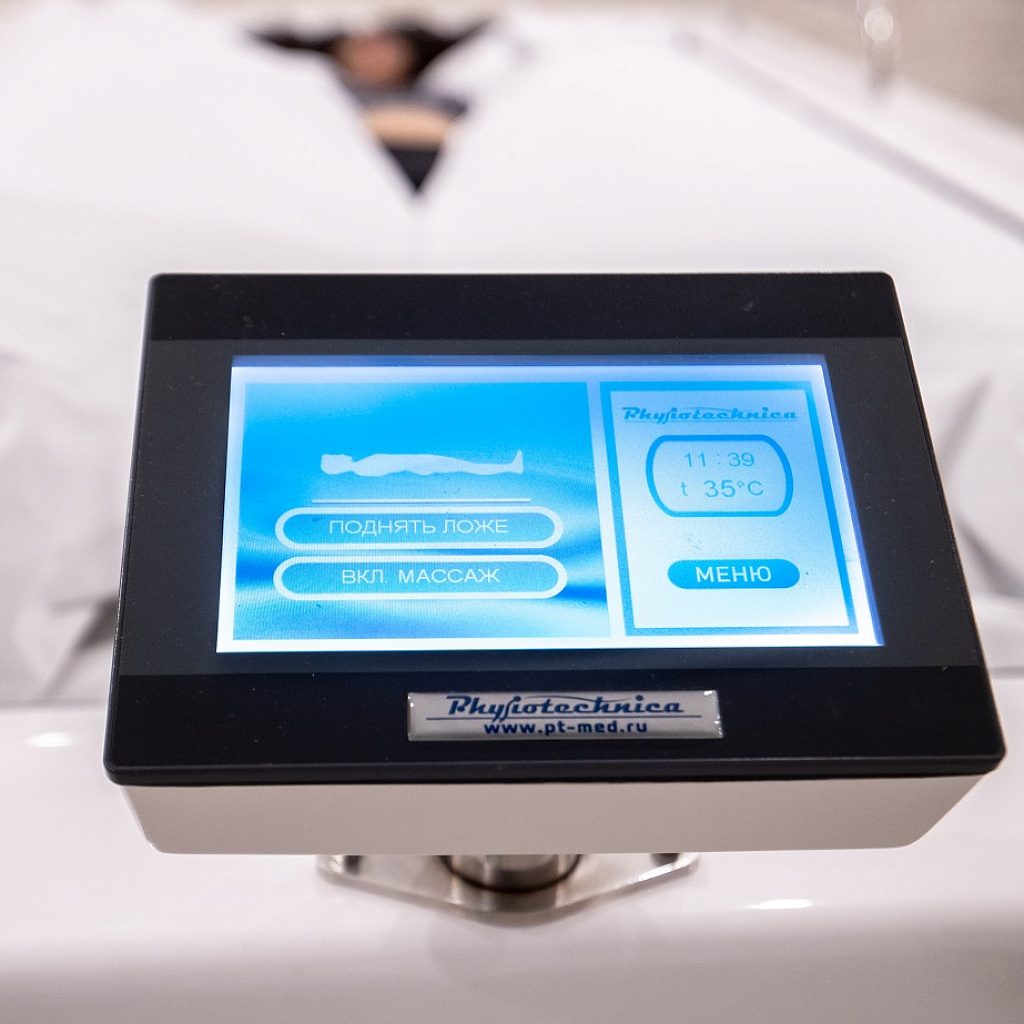 Ванна Посейдон оборудована цветным сенсорным ЖК дисплеем, с помощью которого осуществляется программирование всех режимов и непосредственно управление ходом процедуры медицинским персоналом: